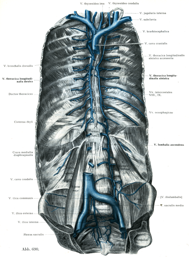 この静脈幹は側腹壁の血液を集め,また前腹壁の静脈とつながっている.背枝と前枝とが合した幹は大腰筋の後方,脊柱の前面をへて下大静脈に向かってすすむが,そのさい左側のものは大動脈のうしろを通る.何本かの幹が脊柱の前でたがいに合して,共通の幹で大静脈に開いていることがある.腰椎の肋骨突起の前にはすでに654頁に記載した上行腰静脈V. lumbalis ascendensという縦走する鎖状の吻合がある.これは上下の腰静脈をたがいにつなぎ,またたいてい総腸骨静脈ともつづいている(図690).