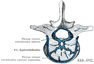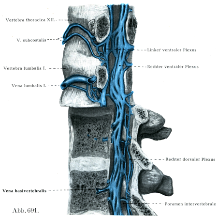 外椎骨静脈叢と内椎骨静脈叢の血液はどの部分でも主に横の方向に流れるのである.そして血液は脊柱の外にある太い静脈,すなわち椎骨静脈,縦胸静脈,内腸骨静脈に入る.