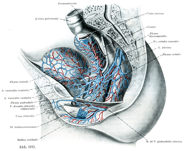 これは特に子宮と腟の側方部を取り囲み,卵巣静脈および骨盤腔の静脈叢とつながっている.それから出る主な流れは短くて幅の広い子宮静脈Vv. uterinaeとなって内腸骨静脈に開口する.