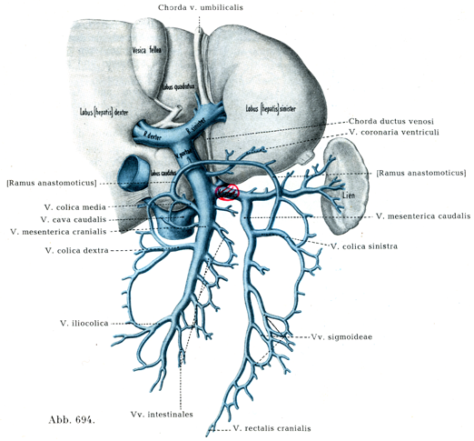 c)下腸間膜静脈V. mesenterica caudalis(図694, 695).これは同名の動脈と全く一致した関係を示している」下方ではこの静脈に属する上直腸静脈V. rectalis cranialisによって広汎な直腸静脈叢とつづいている.骨盤のところから軽く左に凸の弓を画いて上方にすすみ,S状結腸静脈Vv. sigmoideaeと若干本の左結腸静脈Vv. colicae sinistraeを受けとり,個体的にいろいろちがう場所で膵臓のうしろにはいる.たいていこの静脈は脾静脈と合する.またときには下腸間膜静脈が門脈の初まりのところで門脈にはいっている.あるいは上腸間膜静脈に開いていることもある.