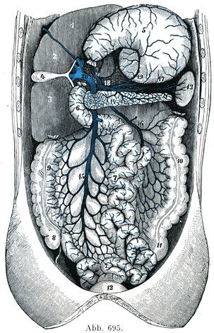 門脈は腹腔の大きな静脈で,多数の内臓静脈が合流してこれをなし,短い経過ののち肝門にはいり(図695, 20),肝臓のなかで枝分れをして,その全部にひろがる毛細管系を作り,すぐ上に述べた肝静脈となって肝臓から出る.