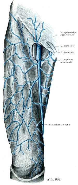 下腿の内側では伏在神経のそばにあり,膝のところで大腿旨の内側顆のやや後方に向い,ついで大腿の前内側面を上行して大腿筋膜の卵円窩にいたり(図697),そこを通り抜けて大腿静脈の上端に合する.