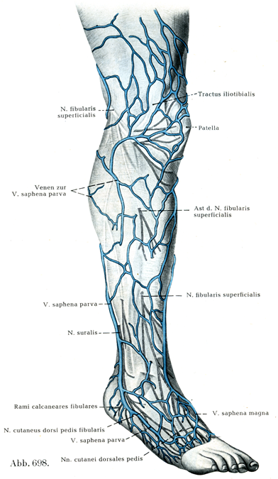 小伏在静脈V. saphena parva(図698~700).この静脈は足背静脈網の外側部から起り腓骨踝のうしろを通って次第にアキレス腱の後に向う.