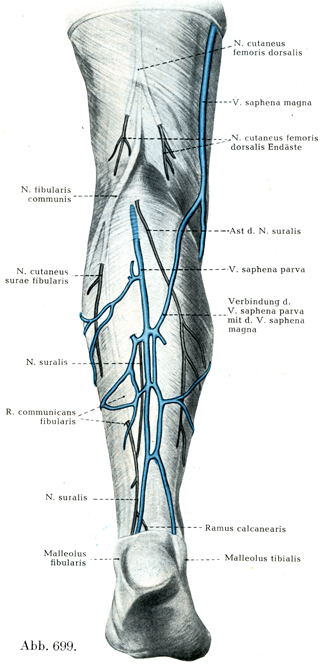 [図699]下腿(屈側)の皮静脈(Corning, topogr. Anatomieによる).