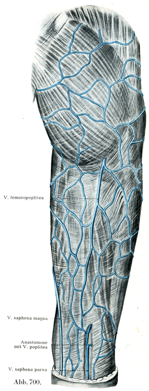 さらに上方では皮下において腓腹神経とともに腓腹筋の両腹のあいだの溝にはいり,筋膜を貫いて膝窩静脈に開口する.走っている途中で浅層の静脈を側方から受けとり,いろいろなところで筋膜を貫いて深層の静脈との結合を示している.浅層にある少数の細い静脈がそれぞれ独立して筋膜を貫いている.大腿の後面でところにより筋膜の上や下を走ったりしている1本の静脈を大腿膝窩静脈V. femoropopliteaという(図700).