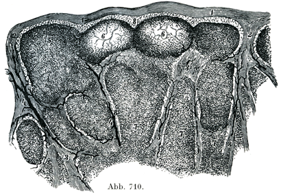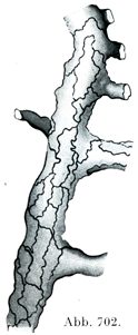 [図704] ヒトの腸壁のリンパ管,集合リンパ小節の領域(Frey, Virchows Archiv,1863による).