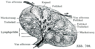 上に述べたすべての腺Drüsenのうちでリンパ節がリンパ管に対してもっとも密接な関係をもっている.大部分の(おそらくはすべての)リンパ管はその途中で1個ないしそれ以上のリンパ節を必ず通過する.