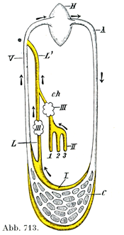 H 心臓;A 大動脈;C毛細管の領域;V 大静脈;L リンパ管の幹;Ch乳ビ管の幹;L'2つの部分が合してできた幹;* リンパ管の幹が静脈系に開くところ. I リンパ管の毛細管領域;II乳ビ管の毛細管領域;III, III リンパ節;1, 2, 3, 3つの小腸絨毛洞.