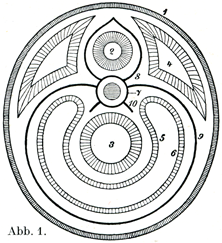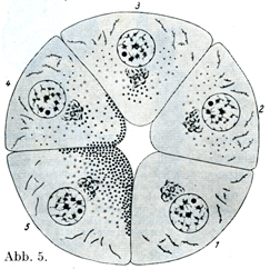 皮膚(1)と体腔の壁側板(6)を除いても体の前後両側にまだいくつかの系統がある.後側には中枢神経系(2)があり,前側には前側の身体要部(ventraler Lezbeskern) (3と5)があって,これは後方で体壁とつながっているが,そのつながりを除くと1つの空所,すなわち前体腔(ventrale Lezbeshöhle) (5と6との間)によって壁側板から界されている.この前側の身体要部と壁側板の一部とが消化呼吸器系,泌尿生殖器系および漿膜嚢といったような,つまり内臓そのものの基にあたる.