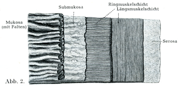 筋層はすべての内臓にあるとは限らないがしかしその分布は広いものである.これは多くのばあい平滑筋線維より成るが,若干の場所では横紋筋である(咽頭・食道の一部・喉頭・陰部).また内臓の多くの部分では筋層のなかで2層が区別され,第3層が加わっている所もある.2層をなしているときはその各々がたがいに直角をなす方向に走っていて,ふつうには外方の縦走線維層Längsfaserschichtと, 内方の輪走線維層Ringfaserschichtとがある(図2,90).血管,リンパ管,神経線維と神経細胞もこの層にたくさんある.結合組織がその外側を被って,筋層の内部にもはいっている.