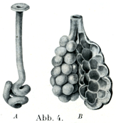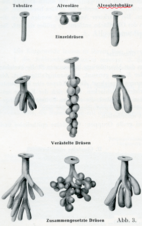 β)分枝腺verdstelte Drüse.これは導管Ausführungsgangとよばれる1本の幹からたがいに同価値のいくつかの枝がでている.その1つ1つの枝が上述の単一腺と同じものである.(StöhrのいうRöhrensystem(管系統の意)).