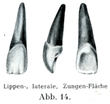 a)上の切歯obere Schneidendhne a)上の内側切歯(上顎の第1切歯あるいは中切歯)は常にその外側にある切歯(第2切歯あるいは側切歯)より大きい.歯冠の前面は4辺形であって,軽い凸をなし,ここに縦走する2本の浅い溝がある.下内側の隅は直角をなし,下外側の隅が円みをおびている.歯冠の後面はへこんでいて,3角形を呈し,その内側縁と外側縁に1つずつの高まり(辺縁隆線Randleistのがあって,これらが歯冠の頚部で相合して1つの低い高まり,すなわち基底結節Tuberculum dentisをなしている.接触面は3角形をなし,そのエナメル質の縁はV字形を呈している.歯根は円錐状で常に単一であり,4面をもっていて,根の先端は尖らず,むしろ鈍く終わっている.正常な形の顎をもつ人Orthognathenでも上の内側切歯の根は後方に傾いている(16~20°).また歯髄腔は歯じしんとよく似た形をしていて,切縁に向かったところで3つの小さい尖頭をもっている.歯根管の横断形は円に近い.