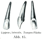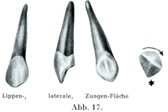 a)上の犬歯.唇面(前面)が横の方向において著しい膨らみをもつことはこの歯を尖端の方からみるとよく分る.内側と外側の切縁が接触面と合するところの角は高さが異なっており,その強さも同じでない.外側の角の方がいっそう高い所にあり(すなわち歯冠の底にいっそう近い),かつ平らであって,内側の角はいっそう低い所にあり,かつ著しく(外側切歯の方に向かって)突出している.鈍い縦の高まり(中心隆線[唇側面隆線]Mittelleiste)によって唇面が2つの3角形の部分に分れている.すなわち内側の比較的せまい部分と外側の比較的ひろい部分とである.舌面(後面)は斜方形に近い形で,ここにも中心隆線があって,これはよく発達した内外両側の辺縁隆線Randleistenといっしょに2つの3角形をした浅いへこみを境している.このへこみは歯の磨滅がすすむと浅くなり,終にはなくなる.基底結節ははなはだしく円みを呈している.つぎに内外両側の接触面は3角形をしていて,エナメル質の境界はむしろ弓状をえがいており(切歯ではかなりはっきりとV字状である),またその境界が内側の接触面では外側面におけるよりも歯冠の尖端にいっそう近い.また言い換えるとエナメル質の境界と歯根尖との距離が内側面では外側面よりもいっそう大きい(その差は1.5mmに達する).歯根はおよそ25 mmの長さがあり,側方から押された形で,内外の両側面に縦の溝がある.根の前縁は幅がひろくて,ことに歯冠の近くでは面をなしてひろがり,後縁は狭くて角だっている.歯根尖はしばしば外側にまがっている.