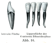 b)下の切歯.これらはすべての歯のうちで最も小さいものである.ことに下の内側切歯(下顎の第1切歯あるいは中切歯)が小さい.歯冠の前面は長めの4辺形であり,接触面からみると歯冠がかなりのみの形に近い.前面は多くは平滑で高低がなく,ただまれに縦の溝をもつのみである.縦の方向にも横の方向にも膨らみを呈することがごく少ないので,歯冠前面の弯曲のぐあいで左右を見わけることははなはだ困難である.後面は縦の方向に凹であって,横の方向にはごくわずかにへこんでいるのみ.辺縁隆線Randleistenはほとんど見られない.後面の下部にある結節は上の切歯におけるほどその境がはっきりとしていないが,しかし接触面からみたときに最もよく分るようにかなり著しく突出している.なお接触面からみて分ることは,前面と後面が歯冠の中央の高さまでは相近づいていて,それより歯根の方に向かってだんだんとたがいに遠く離れるようになる.下の切歯の切縁は直線的である.この切縁が下の内側切歯ではその両側の接触面とほとんど直角を呈している.したがって下の内側切歯では隅角徴によっても左右を区別することができない.しかし下の外側切歯ではそれがしばしば可能である.もっともこの場合も磨滅によってその目標がまもなく消えてしまう.そのときにも外側の接触面の走り方が(この歯の前面を前方からみるとき)斜めの方向に下内側から上外側にのびているということが左右の外側切歯を区別する1つの目標になる.しかしこの目標はいつも明瞭であるとはいえない.歯根は側方から押された形で,両接触面に浅い縦の溝をもっている.この縦溝は外側面にあるものが必ずいっそう深い.歯根が1つの縦溝しか持たないときは,それがいつも外側面にある.この点が下の切歯で右と左のものを見わける1つの重要な補助手段である.下の内側切歯の根はしばしばまっすぐに伸びており,外側切歯の根は外側に曲がっていることが多いが,これが内側に曲がっていることも時おりある.