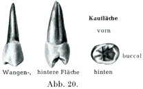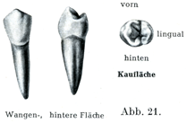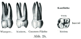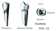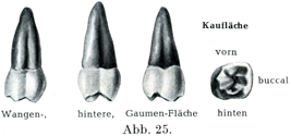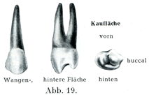 β)上の第2大臼歯.これは第1大臼歯よりも小さくて,やはり3つの主な形が区別できる.第1の形のものはすべての性質が第1大臼歯に近いものであるが,カラベリ結節Tuberculum anomaleに当るものはほとんどみられることがない.第2の形は後方の口蓋側咬頭の退化のために3つの咬頭しか存在しないものである.第3群は側方から圧縮された奇妙な形のもので,それでも第1および第2の形からたやすく導きうるのである.