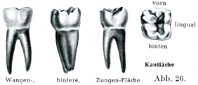 4. 大臼歯Molares, Mahlzähneは多数の咬頭をもつ歯である.それゆえ多咬頭歯Dentes multicuspidatiとよんで2つの咬頭をもつ双咬頭歯Bicuspidatenに対立させられる.大臼歯はすべての歯のなかで最も大きくて,大仕掛けのものであって,第2代の歯ができるときzweite Dentitionに初めて生じ,乳歯のなかにその前身をもっていない.大臼歯はその咀嚼面のひろいことが著しい.第1大臼歯がどこの列でみても最大であって,第3大臼歯が最も小さい.第3大臼歯は著しくおそく生えてくるので智歯Dens serotinus, Weisheitszahnとよばれる.上の大臼歯の咀嚼面は角のとれた菱形といえるような形であり,下の大臼歯のそれはむしろ正方形あるいは長方形に近い.咀嚼面は平らでなくて,4個あるいは5個の咬頭をもち,そのあいだをへだてる交叉した形の溝がある.この溝が上の大臼歯ではH字形をなし,下の大臼歯では十字架の形である.上の大臼歯では口蓋側(内方)の咬頭が高く,下の大臼歯では舌側(内方)のそれがいっそう高い.上の第3大臼歯では多くのばあい口蓋側の咬頭が合同している.その歯冠が他の大臼歯の咀嚼面にまで達していないことがはなはだしばしばであり,そのほかなおいっそう高度の退化現象が第3大臼歯についてみられるので,この歯は消滅しかけているものと考えられる.大臼歯の歯冠の接触面は前後とも歯頚に向かってせまくなるが,舌面(あるいは口蓋面)と頬面は歯頚に向かってひろくなる.大臼歯の根は分岐している.
