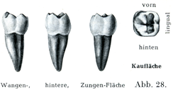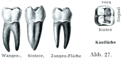 歯の形態学的な区別morphologische Unterschiede.人間の歯は異型歯heterodontである.すなわち個々の歯が著しく異なった形を呈している.そこで切歯Dentes incisivi, Schneidezähne,犬歯Dentes canini, Eckzähne,小臼歯Dentes praemolares(2つの咬頭を咀嚼面にもつので双咬頭歯Dentes bicuspidatiともいう),Backenzähne,大臼歯Dentes molares(3つ以上の咬頭をもつので多咬頭歯Dentes multicuspidatiともいう),Mahlzäihneに分類される.