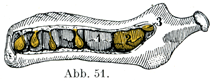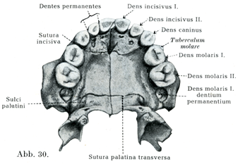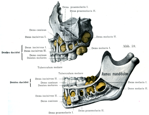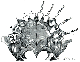 左右各半の歯列はそれぞれの顎半分がもつ5つの歯槽のなかにある.そのほかになお永久歯の第1大臼歯のための第6番目の歯槽があるが,これはしかしまだ独立していないで,乳歯の第2大臼歯の歯槽とつづいている.なおまた永久歯の内外の両切歯と犬歯と第1小臼歯の歯小嚢を入れるための4つのくぼみがある(図50, 51).
