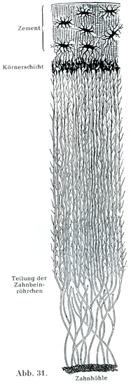 ゾウゲ細管はその経過のあいだに多数の細い横枝Queräste(側枝Kollateralen)をだして,これらの枝は近くの細管の枝と結合したり,あるいは行きづまりをして終つたりする.歯根の範囲およびゾウゲ質の縁のところで,こういう横枝がとくに数多く存在する.セメント質との境のところでゾウゲ細管は細かい枝分れをして終り,その細かい枝は歯頚と歯根の範囲では小さい腔所(球間腔Spatia interglobularia)の集まった1層すなわちトームス顆粒層Tomessche Körnerschicht, Schicht der kleinen Interglobularräume(図31)に移行している.そしてこめ顆粒層の小さい腔所がさらにセメント質の骨小腔とつながっているのである.