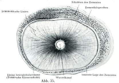 3. セメント質Substantia ossea, Zementはゾウゲ質の表面でエナメル質に被われていない部分を被っている本当の骨組織の薄い層であって.その厚さは歯根尖に向かって次第に増すのである.これが特によく発達しているのは歯根尖のところ,複合根の溝に沿うところ,また多根歯の根のあいだにあるへこみである.