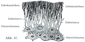 ゾウゲ質はゾウゲ細管のすぐ周りのところおよび歯髄腔の表面に接して,比較的に固くてv. Saal(Z. Zellforsch.,1920)によると石灰沈着していない層があって,歯線維鞘Zahnfaserscheide(Neumann)あるいは境界膜Grenzhdutchen(Kölliker)という.ゾウゲ細管のなかにあるゾウゲ質線維Zahnfasernはゾウゲ芽細胞の突起であるが,細管の内部をみたすのでなくて,管のなかで少量の組織液によりとりまかれている(図36).