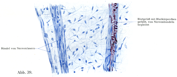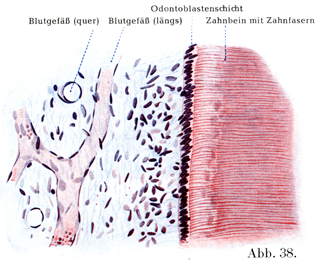4. 歯髄Pulpa dentis, Zahnmark(図38, 39)は細胞に富む微細線維性の結合組織よりなっていて,そのなかに多数の脈管と神経がひろがっている.その動脈は顎動脈からくるし,神経は三叉神経の第2と第3の枝からくる.リンパ管はSchweitzerによると歯冠部の歯髄にあるリンパ毛細管の叢から発する.1本あるいは2本以上の広いリンパ管として歯根尖からでてゆく.歯髄の最外層のところが特別に重要である.それはここにゾウゲ芽細胞Odontoblasten, Dentinzellenという大きな細長い細胞が1列をなしてならんでいるのであって,この細胞はそれぞれいくつかの突起をだしており,相合してかなり固く結合した1つの膜すなわちゾウゲ芽細胞層Odontoblastenschichtをなしている(図38).おのおのの細胞からゾウゲ芽細胞突起Dentinfortsätzeが1本あるいは2本以上でてゾウゲ細管内のいわゆるゾウゲ質線維Zahnfasernとなっている.また側方にでる突起seitliche Fortsätzeが隣りあう細胞をたがいに連ねており,さらに基底方向にでる1つの突起ein basaler Fortsatzが歯髄突起Pulpafortsatzであって,これはふつう歯髄のいっそう深部にある細胞と結合しているのである.