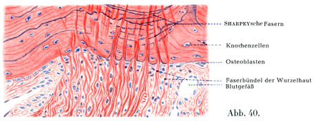 [図40] 上下の歯槽の骨壁におけるシャーピー線維×250.歯根膜の線維束がシャーピー線維として骨をつらぬく.