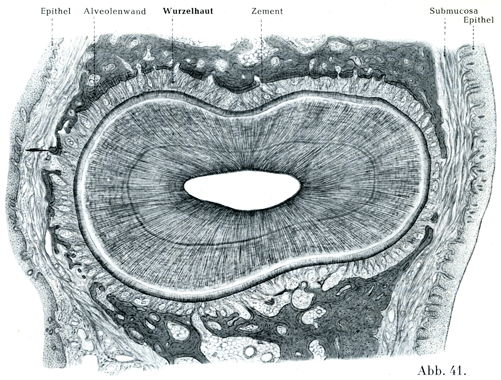 [図41] 歯根膜 下顎の左の犬歯の根を歯槽縁のすぐ下方の高さで横断したもの.