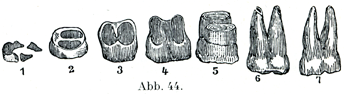 1.5つの咬頭のでき初めのもの(Zahnscherbchen,歯小片の意);2と3. 歯冠が歯頚のところまでできて,2根性が初めて示されたところ;. 4.2つの根への分離;5と6と7. 根の発達がさらに進んでいる.