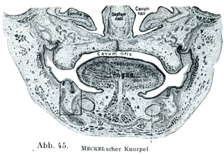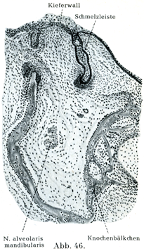 人の胎児では第3月の初めに上下顎の縁にあたる粘膜が著しく円みをおびた隆起,すなわち顎壁Kieferwallをなして高まっている.ここで上皮の深層が稜状をなしておちこんで歯堤Zahnleiste, Schmelzleiste(図45, 46)をつくる.外方からみると縦走する浅い1本の溝すなわち原始歯溝Primitive Zahnfurcheがそのおちこんだ場所を示している.この歯溝は両側で歯壁Zahnwallという高まつた縁をもって境されている.