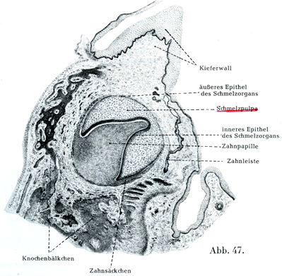 結合組織性の歯乳頭を帽子のように囲んでいる歯胚の部分はこの時以後,エナメル器Schmelzorganとよばれる(図47).まだ上皮性の柄がこれを歯堤に付着させている.エナメル器と歯乳頭の長さがいっそう増すにつれて,歯乳頭がますます歯小嚢から分れる.一方,歯小嚢は次第に伸びてエナメル器の全体を被い,遂に完全に開じるようになる.そのときにはエナメル器の柄はなくなる.
