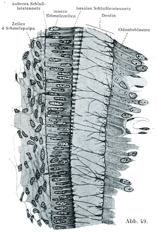 エナメル質の形成はつぎのようである.これは初めから稜柱の形をしたものとしてあらわれてくる.その場合,ひじょうに長くのびたエナメル芽細胞じしんがゾウゲ質に向かった端から次第に石灰化するのか,あるいはエナメル芽細胞がゾウゲ質に向かった端のところに或る物質を分泌して,この物質が石灰化するのかどちらかである.そして石灰化しない接合質がこの稜柱のあいだを充たしてまとめ合せている(v. Ebner). Speeの研究によるとエナメル芽細胞の内部に球る種の有機性の代謝産物がまずできて,これが無機性の塩類と比較的たやすく結合して不溶性のものとなる性質をもつのである.かくしてますます固いものとなってゆく.固くなるのはまず最初にエナメル細胞のゾウゲ質にずぐ隣っている部分のしかも辺縁部Randteileであって,そのとき中軸部Achsenteilはしばらくの間は固くない.後にはこの中軸部にも石灰化がおこる.Heldがこの現象を研究した結果もいま述べたのとはなはだ近いのである(Z. mikr. anat. Forsch., 5. Bd.,1926) (図49).