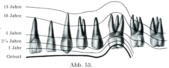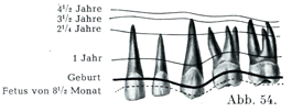 図53は永久歯,図54は乳歯,横走する線は左に記してある年令において個々の歯がどこまで形成されているかを示すのである(E. Ballowitzの表による).