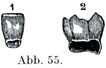 代生歯が伸びてきて,その周囲ことに代生歯の上方にある乳歯の根に絶えず圧力を加える.そのためにこの部分が次第に吸収されることになる(図55).多数の巨大細胞(破骨細胞Osteoklasten)がその吸収にあずかっている.最後に乳歯は薄い狭い縁で歯肉になおくつづいているが,もしもこのとき外からのはたらきで前もって除かれなければ,永久歯がでてきて押して乳歯が脱けおちるのである.
