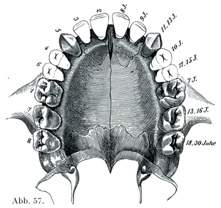 歯の埋伏Retentionはとくに上顎の犬歯で比較的多くみられる.歯数の増加もやはりまれなことである.いっそう多いのは見掛けの増加scheinbare Vermehrungであって,これは乳歯の1つが脱落しないで残っていて,代生歯がその近くで萠出しているのである.第3切歯がみられることはごくまれであり,第4大臼歯も珍しいものである.第4大臼歯は広鼻Platptrhinの猿類には正常であるが,狭鼻katarhinの猿類は人と同じ歯式をもつのである.いろいろな型の顎骨裂Kieferspalteのばあいに時として歯数が変化をうけている.そのときに歯数がふつうより増していることさえある.まれなことであるが,老人に代生歯の形成がなお1度いろいろな程度におこることがある(老人性生歯Dentitio senilis).
