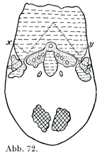 [図72]上下の舌における各種の腺の分布 (A. Oppel, Festschrift Kupffer 1899による.但し少しく変更してある)漿液腺は点状,粘液腺は横の破線,混合腺は斜めの格子状で示す.X-Yの線は小胞腺の領域の前方境界である.異なる種類の2つの腺が重なり合うところでは上にあるものだけが見えるようにして,下にかくれている分は点線をもってその輪郭を示してある.