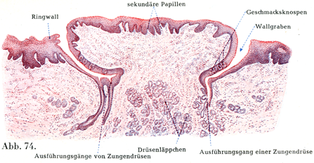 3. 有郭乳頭Papillae circumvallatae(図69, 70).ふつう7~12個あって,それがV字形に折れまがった1本の線をなしてならんでいる.そのV字のまがり角は舌盲孔のすぐ前のところにあり,開いた角は前方に向かっている.この乳頭の1つ1つは円錐の形で,その尖端が下方に深く舌のなかに沈んでいるので円錐の底は周囲の舌表面よりごくわずかしか高まっていない.おのおのの乳頭が輪形をした濠Grabenによって囲まれている.この濠を境する内外の両壁は重層扁平上皮で被われて,そのなかに何百という味蕾がある.また多数の漿液性の腺が濠の底に開いて,分泌物をそとに出している.有郭乳頭の内部は大部分が結合組織でできていて,この結合組織は乳頭の自由面(濠に向かっていない表面)では多数の低い結合組織性2次乳頭をなして高まっている.しかしこの2次乳頭は重層扁平上皮のなかに入りこんでいるだけで,上皮の表面がそのために高まることはほとんどない.それゆえ有郭乳頭の表面はだいたいに平滑である.時として2個あるいは3個の乳頭が1つの共通の濠によって囲まれている.