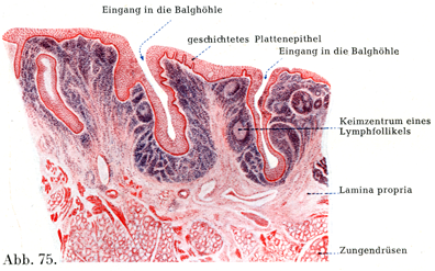 舌の小胞腺は舌小胞Folliculi linguales, Zungenbälgeとよばれて,後舌の範囲にあって,後方は喉頭蓋,また側方は口蓋扁桃にまで伸びている.舌の小胞腺の全部を合わせてまた舌扁桃Tonsilla lingualisともいう(図69).個々の小胞腺は舌の表面の円みをおびた低い高まり(直径1~4mm)としてたやすく認められる.その中心にある小さい口から奥に入ると小胞腔があつで,ここは粘膜のつづきが腔所をとりかこんでいる.小胞腺じしんは固有層のなかにあるリンパ性組織の厚い板であって,この板が腔所をとりかこんで弯曲しており,またリンパ組織のなかにかなり多数の胚中心Keimzentrenの存在することがしばしばである(図75).粘膜の一部がこの弯曲した板の外面をとりまいて,これが小胞腺の線維被膜Faserhülle, Kapselをなしている.つまり舌小胞は粘膜壁の一部がリンパ性に変化して落ちこんだものであって,全体として扁豆形あるいは球形をなしている.個体が生きている間は絶えず多数のリンパ球がリンパ性組織からでて上皮を通りぬけて小胞腔に出る(遊出Diapedesis).そしてここから唾液に加わるのである(唾液小体Speichelkörperchen).小胞腔をかこむ上皮にはしばしば広い範囲にわたってリンパ球がひどく瀰漫していて,そのために上皮の境が分らないほどになっている.そのさい上皮が広い範囲で破壊することも容易におこるのである(Stöhr).しかしこの点については58頁のHellmannの説をも参照のこと.