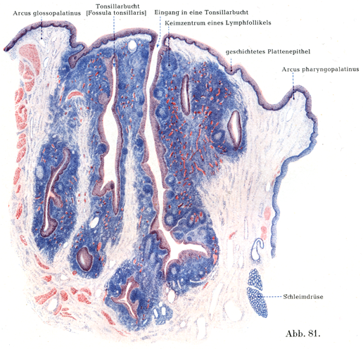 扁桃内の腔所の壁は乳頭をもち,この乳頭は枝分れしないのと枝分れするのと両方がある.舌の小胞腺ですでに述べたように,ここでも個体の生きている間はリンパ球が上皮を貫いて腔所のなかに絶えず出てゆく.