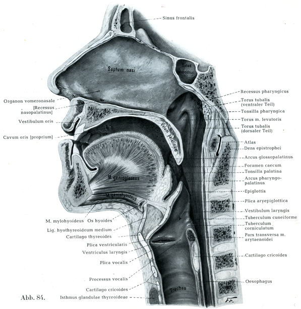 [図84]顔面頭蓋ならびに咽頭と喉頭を合せて正中面の少し横で矢状断をしたもの (6/7)