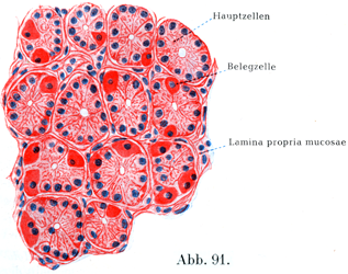 a)胃底腺Glandulae gastricae.この腺の数は莫大であって,1qmmの表面におよそ100個ある.これは不分枝あるいは叉状に分岐する管状腺であって,それが1個だけで,あるいは2個以上がいっしょに,1つの小さい前庭Vorraumに開口しており,粘膜の表面像ですでに胃小窩Foveola gastricaとして述べたものは,この前庭の入口である.胃底腺は上皮細胞の列およびそのそとに接する基礎膜でつくられており,基礎膜のそとを粘膜の結合組織部すなわち固有層がとりかこんでいる.