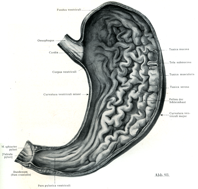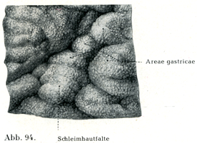 粘膜は幽門部では胃体よりいっそう厚く,胃底では胃体よりいっそう薄くできている.そして胃壁がひっぱられていないときには粘膜の内面が多数の長短いろいろの低いひだをなしており,これが種々の方向に走っているが,噴門と幽門に向かっては放射状にならんでいる.小弯に沿って縦走するいくつかのひだがしばしばみられて(図93),これらがWaldeyerの命名したMagenstrasse(胃の通路の意)をなしている.胃の壁がひっぱられると,これらのひだはすべて消える.