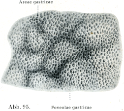 胃の粘膜には大きいひだのほかに胃小区Areae gastricaeという小さい高まりが存在し,これは規則正しい浅い溝によってたがいに分けられ,またこれによって粘膜の乳頭状態Status mamillarisがひきおこされるのである(図94).胃小区の内部にはなはだ多くの点状の小さいくぼみがあって,胃小窩Foveolae gastricae, Magengrübchenとよばれ,これは胃腺の前庭が開く口である(図95).