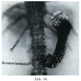 [図96]胃のレントゲン像 背腹の方向に照射. 少量の造影剤を用いてある.粘膜の像は正常. (W. Knotheの作)