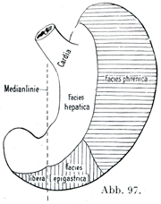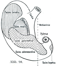 したがって接触面としてつぎのものがある.肝臓面Facles hepatica,自由面(あるいは腹壁面)F. libera s. epigastrica,横隔面F. phrenica,膵臓面F. pancreatica, 結腸結腸間膜面F. colomesocolica,腎臓面F. renalis,腎上体面F. suprarenalis,脾臓面F. lienalis(図97,98).肋骨下角のところにある自由面と肝臓面が,前腹壁のいわゆるMagengrube(胃窩)に当たっている.
