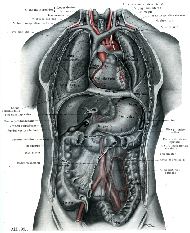 [図99]胸部と腹部の内臓の位置 胸部と腹部の前壁を除き 内臓の一部もとり去ってある.