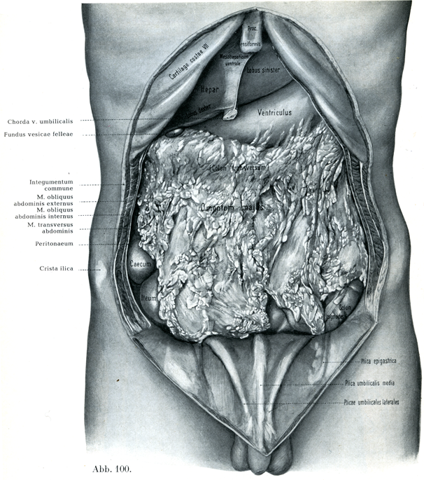 [図100]腹部内臓の位置関係I 前腹壁を除いたまま自然の状態における腹部内臓の全景.