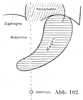 しかし横たわっている体では大弯が前方に,小弯が後方に向いている.そしていわゆる前壁が上方に,後壁が下方に向うのである(Fr. W. Müller, Klinische Wochenschrift, 2. Jhrg.1923).このことからして,レントゲン線で照らしてみたときの胃の影像がまちまちであることが理解できる.すなわち直立位の体ではサイホン形Siphonform(図101)であり,背位のときは牛角形Stierhornform(図102)である.