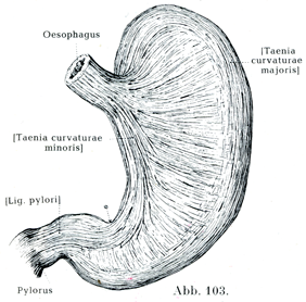 筋層Tunica muscularis,これは平滑筋からできていて,3層を成している(図103,104).最外層は縦走線維層Stratum longitudinale, Längsfaserschichtで,その縦走線維は食道の縦走線維のつづきをなし,食道から胃壁に放射状に広がっている.縦走線維は大弯に沿ってはなはだよく発達しており,また特に小弯の両側で強く発達している.しかし小弯に沿う縦走線維は幽門部ではなくなるのであって,幽門部の小弯では約5cmの長さにわたって,全周のおよそ1/4が全く縦走線維を欠くのである.胃体の前後両面ではこの層が多数のごく細い小束に分れているので,数多くの平行線の縞がみえる.幽門部の前後の両面では縦走線維がいっそう密集しているため,かなりつよい縦走の条がみえる.これをLigg. pylori(幽門靱帯の意)という.