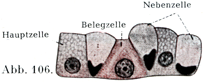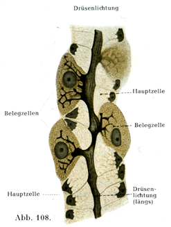おのおのの腺をみると前庭のすぐ近いところが最も細くて頚Halsとよばれ,それにつづいて体Korperがあり,腺が行きづまりになって終るところを底Grundという(図105).腺頚は初めに丈けの低い円柱細胞をもつのみであるが,ついで2種の細胞が1層をなして存在する.すなわち小さい方の副細胞Nebenzellenと大きい方の傍細胞Belegzellenとである.腺体と腺底では主細胞Hauptzellenと傍細胞とがある.頚と体の移行部では3種の細胞がすべてみられる(図105,106).副細胞は粘液細胞に似ているもので,扁平な形あるいは圧されて深いへこみのある核をもっている.主細胞は小さくて暗くみえ,円柱状あるいは円錐状の細胞で,顆粒にとむ原形質と小さい球形の核をもっている.これは多数に存在する(図91,107).